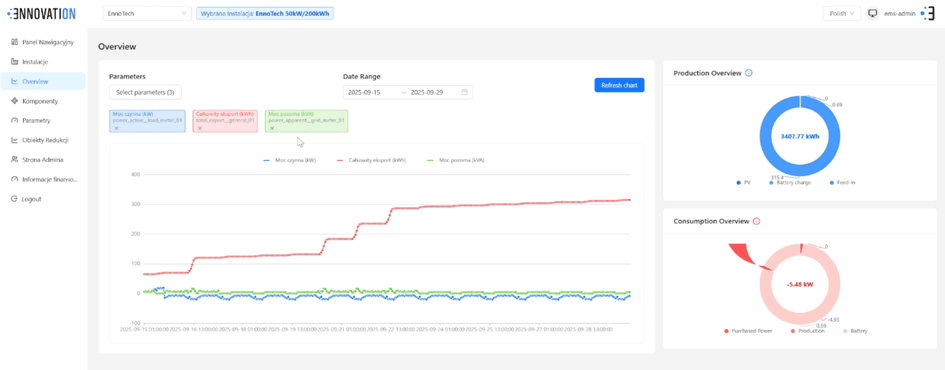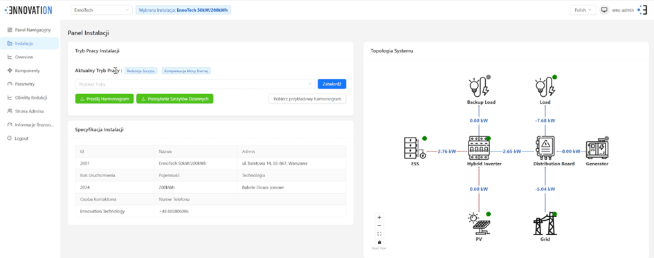 In practice, the battery charges during the most cost-effective periods and exports energy when prices are highest. At the same time, the EMS actively controls power quality parameters, including eliminating reactive power generation — which in this case caused 1,900 PLN in extra monthly fees.